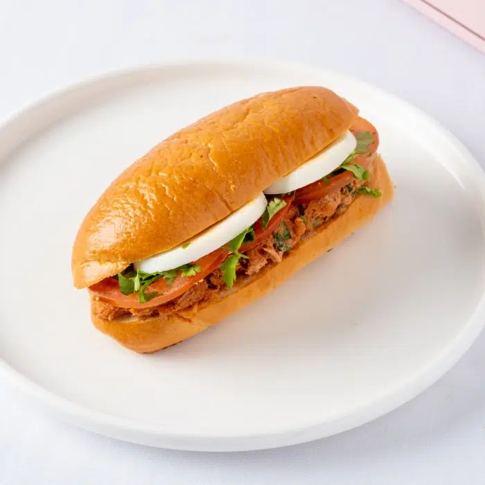 כריך טונסאי במילוי סלט טונה פיקנטי, ביצה, מלפפון חמוץ, פטרוזליה, תפו"א מבושל ולימון כבוש