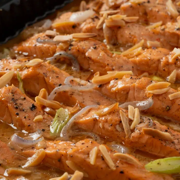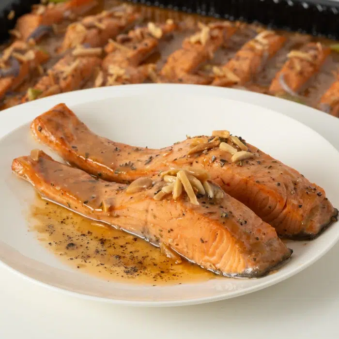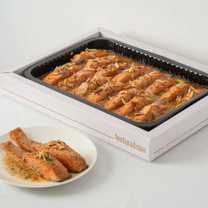 פרוסות סלמון אפויות ברוטב אסייתי , בצל ,פלפלים ,שקדים קלויים. מגיע בתבנית יעודית לחימום 180 מעלות – מומלץ לחמם.