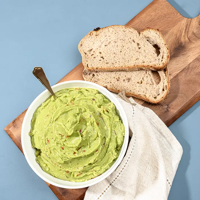 סלט אבוקדו גואקמולי בקערה מרכזית.