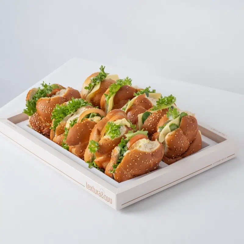 לחמניית קשר רכה – גבינת גאודה , מלפפון , גבינת שמנת , חסה , רוטב עגבניות