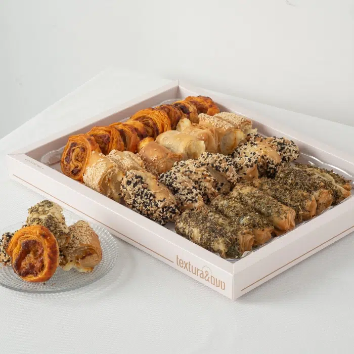 מגש המאפים שלנו בגדלי ביס מושלמים במבחר- פטריות, פיצה, גבינה, תרד ובולגרית לצד רוטב יוגורט.