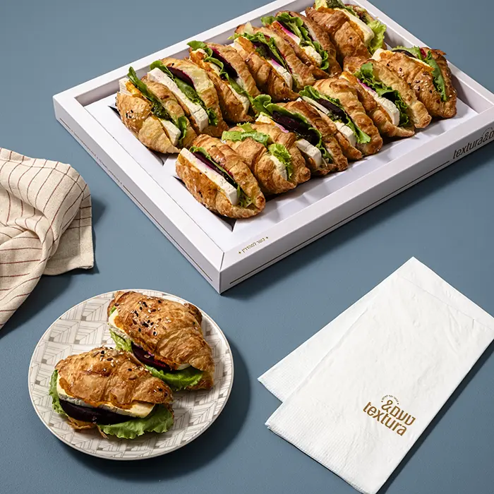 מיני קרואסון עם קרם פלפלים ופסטו, טופו צרוב, חסה, מלפפון ואגוזים קלויים – טבעוני.