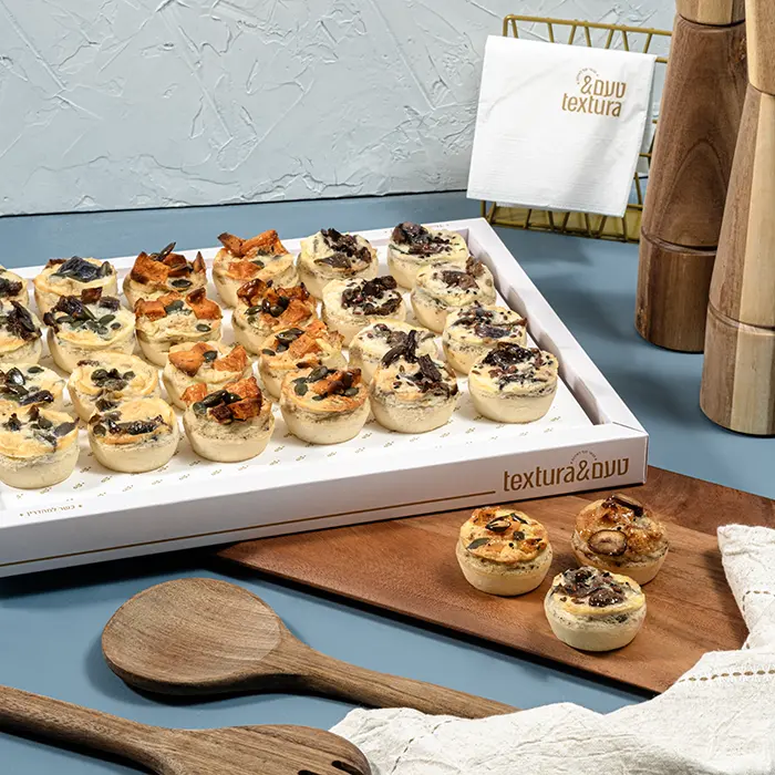 הקישים שלנו עשויים מבסיס של בצק פריך חמאתי עשיר במילויים שונים: בטטה צלוייה / פטריות מוקפצות ובצל מקורמל / זוקיני