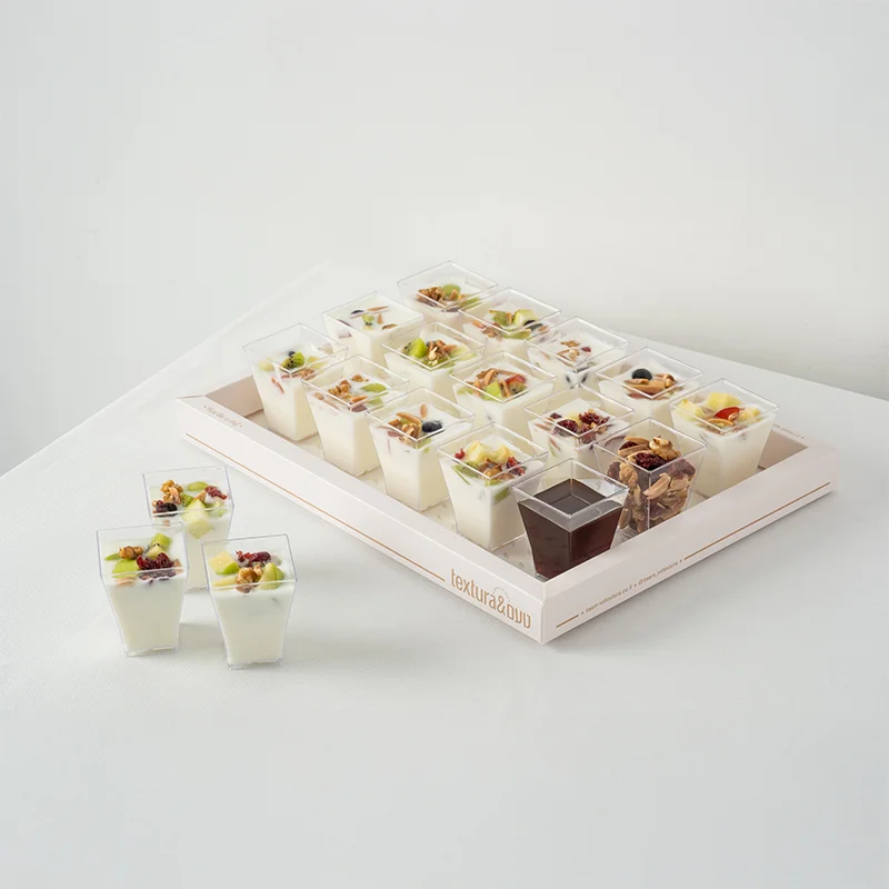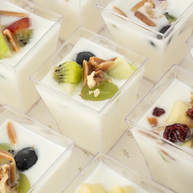 מגשי מוזלי אישיים עם יוגורט יווני, סלט פירות טרי וגרנולת הבית.