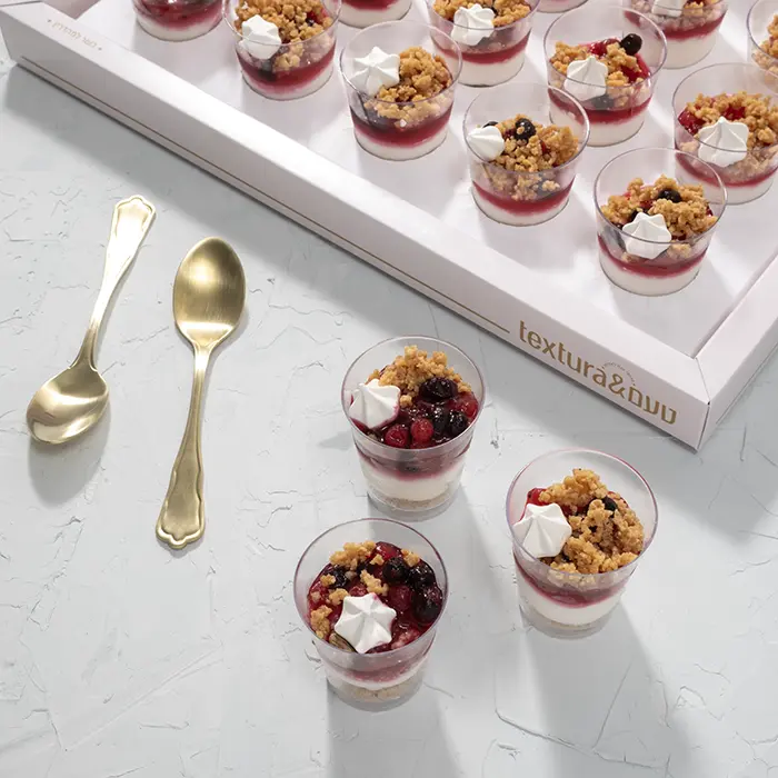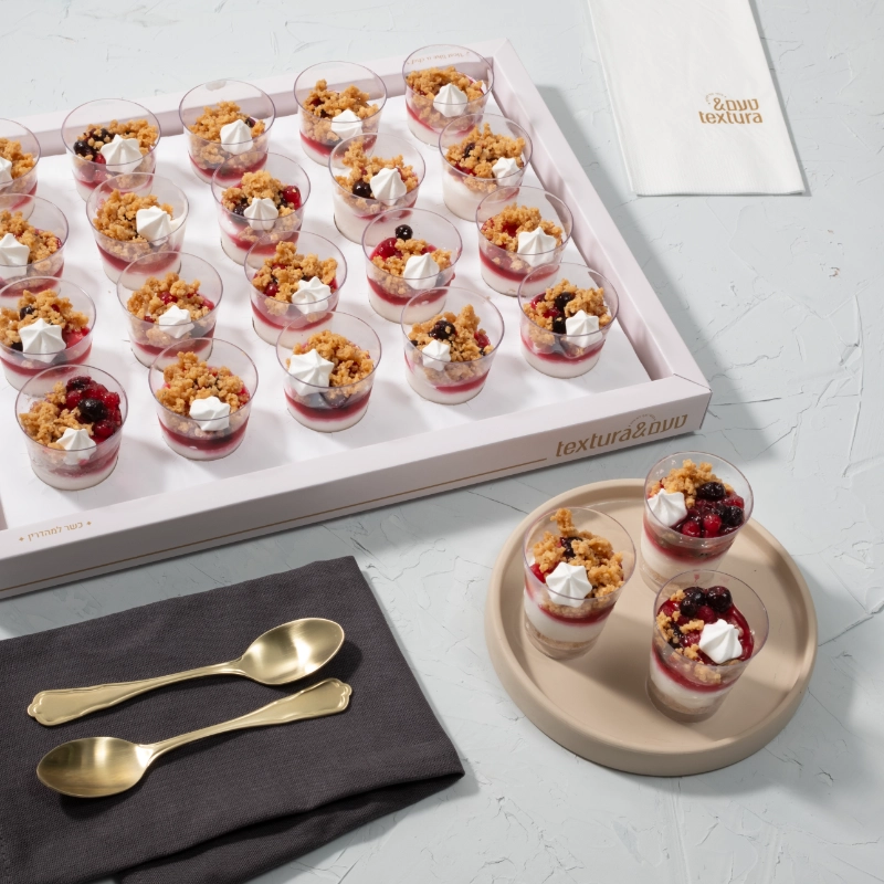 20 יח' כוס מוס גבינה פירות יער, מרנג קרמבל בכוסות ופיסטוק.