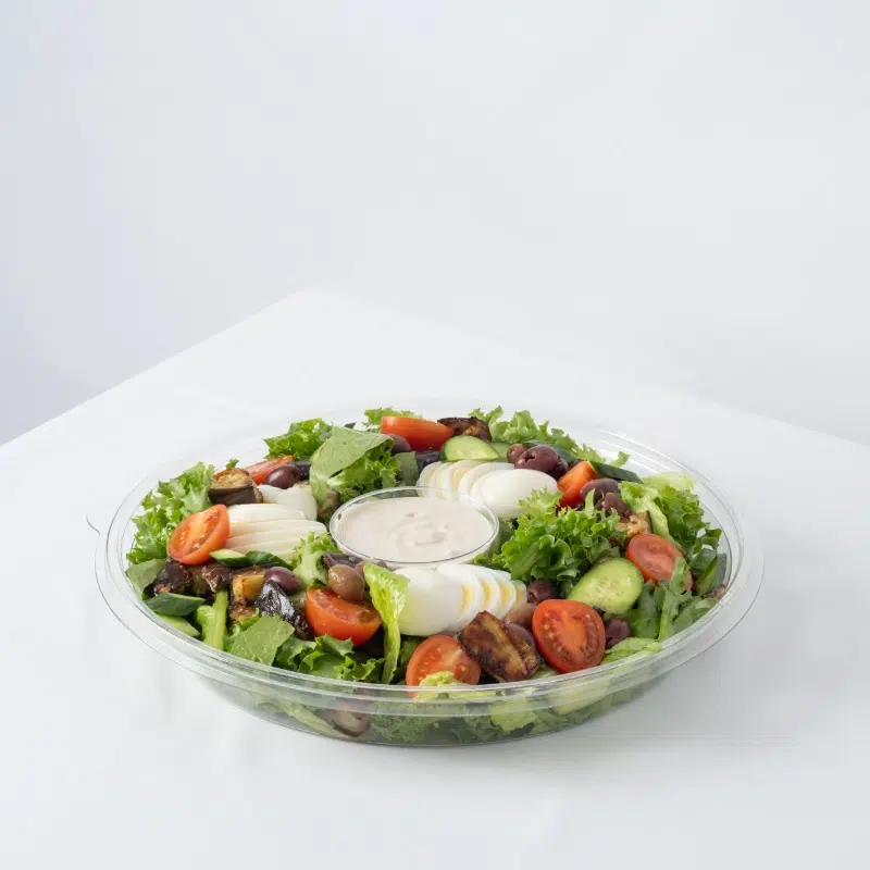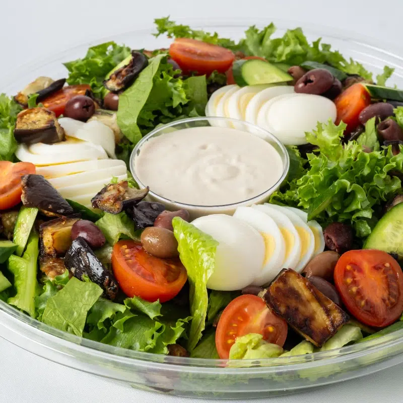 חסה , חציל קלוי , קלמטה , ביצים קשות , מלפפון , עגבנייה , גרגירי חומוס , ויניגרט לימון שמן זית